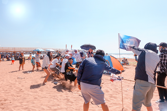 第二天大家又收拾好行囊,準(zhǔn)備趕往黃島金沙灘,路上大家一起見證了跨海大橋雄偉壯闊,在黃島金沙灘上,伴著藍(lán)色的大海金色的沙灘,小伙伴們開始了拔河比賽、踩氣球比賽、蒙眼背人游戲,一聲聲加油,一句句吶喊,讓快樂傳遞給彼此,讓友誼凝聚在心間。