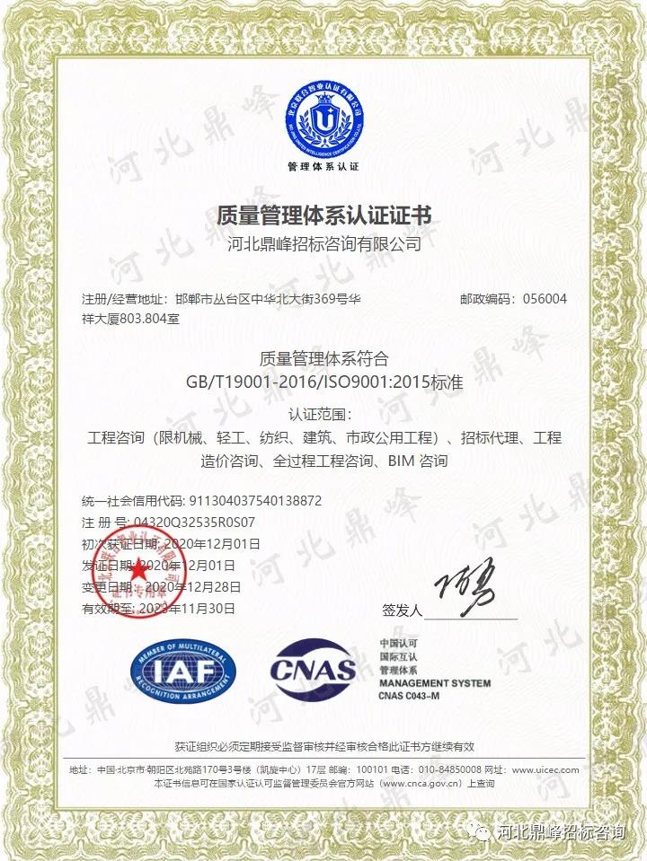 近日,河北鼎峰招標(biāo)咨詢有限公司榮獲了ISO9001質(zhì)量管理體系認(rèn)證證書,認(rèn)證范圍包括了工程咨詢、招標(biāo)代理、工程造價(jià)咨詢、全過程工程咨詢、BIM咨詢等領(lǐng)域。負(fù)責(zé)ISO9001品質(zhì)體系認(rèn)證的機(jī)構(gòu)都是經(jīng)過國(guó)家嚴(yán)格把關(guān)的權(quán)威機(jī)構(gòu),對(duì)企業(yè)的品質(zhì)體系的審核是非常嚴(yán)格的。