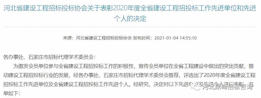 近日,由河北省建設工程招標投標協(xié)會評定的“2020年度全省建設工程招投標工作先進單位和先進個人”名單揭曉,河北鼎峰招標咨詢有限公司,已連續(xù)三年榮獲“2020年度河北省建設工程招投標工作先進單位”榮譽稱號,我公司陳曉華女士榮獲“2020度河北省建設工程招投標工作先進個人”榮譽稱號。