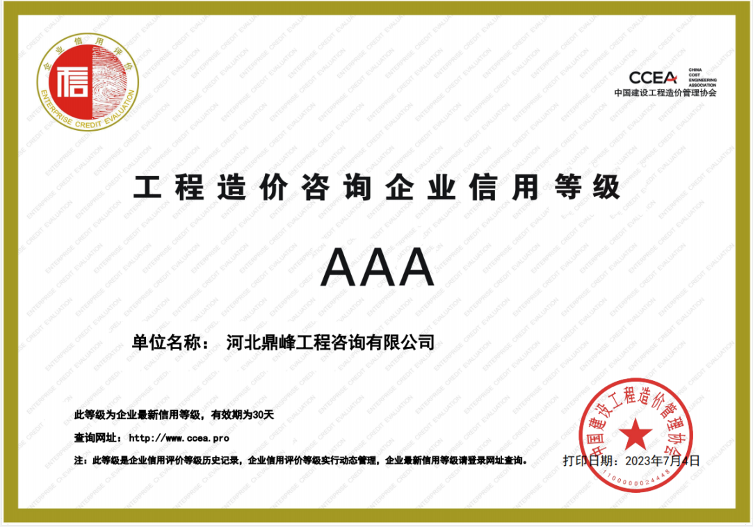 中價(jià)協(xié)“AAA企業(yè)信用等級(jí)證書(shū)”代表了造價(jià)行業(yè)企業(yè)信用評(píng)級(jí)的最高級(jí)別,是判斷企業(yè)整體實(shí)力的重要標(biāo)志,也是對(duì)公司的肯定和鞭策,充分反映了河北鼎峰在經(jīng)營(yíng)發(fā)展和咨詢服務(wù)中多年積累的良好企業(yè)信用,更是為公司以后的發(fā)展奠定了堅(jiān)實(shí)基礎(chǔ)。一直以來(lái),鼎峰始終堅(jiān)持“質(zhì)量為生存之本 ,服務(wù)為發(fā)展之源”的服務(wù)準(zhǔn)則,為客戶提供精細(xì)、高效、全面的造價(jià)咨詢服務(wù)。