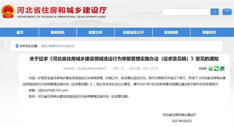 為進(jìn)一步規(guī)范全省住房城鄉(xiāng)建設(shè)領(lǐng)域違法行為舉報(bào)受理辦理工作,加大對(duì)違法行為的查處力度,推進(jìn)依法行政,近日,省住房和城鄉(xiāng)建設(shè)廳對(duì)《河北省住房城鄉(xiāng)建設(shè)領(lǐng)域違法行為舉報(bào)管理實(shí)施辦法》(以下簡(jiǎn)稱《辦法》)進(jìn)行了修訂?!掇k法》自2021年9月15日起施行。